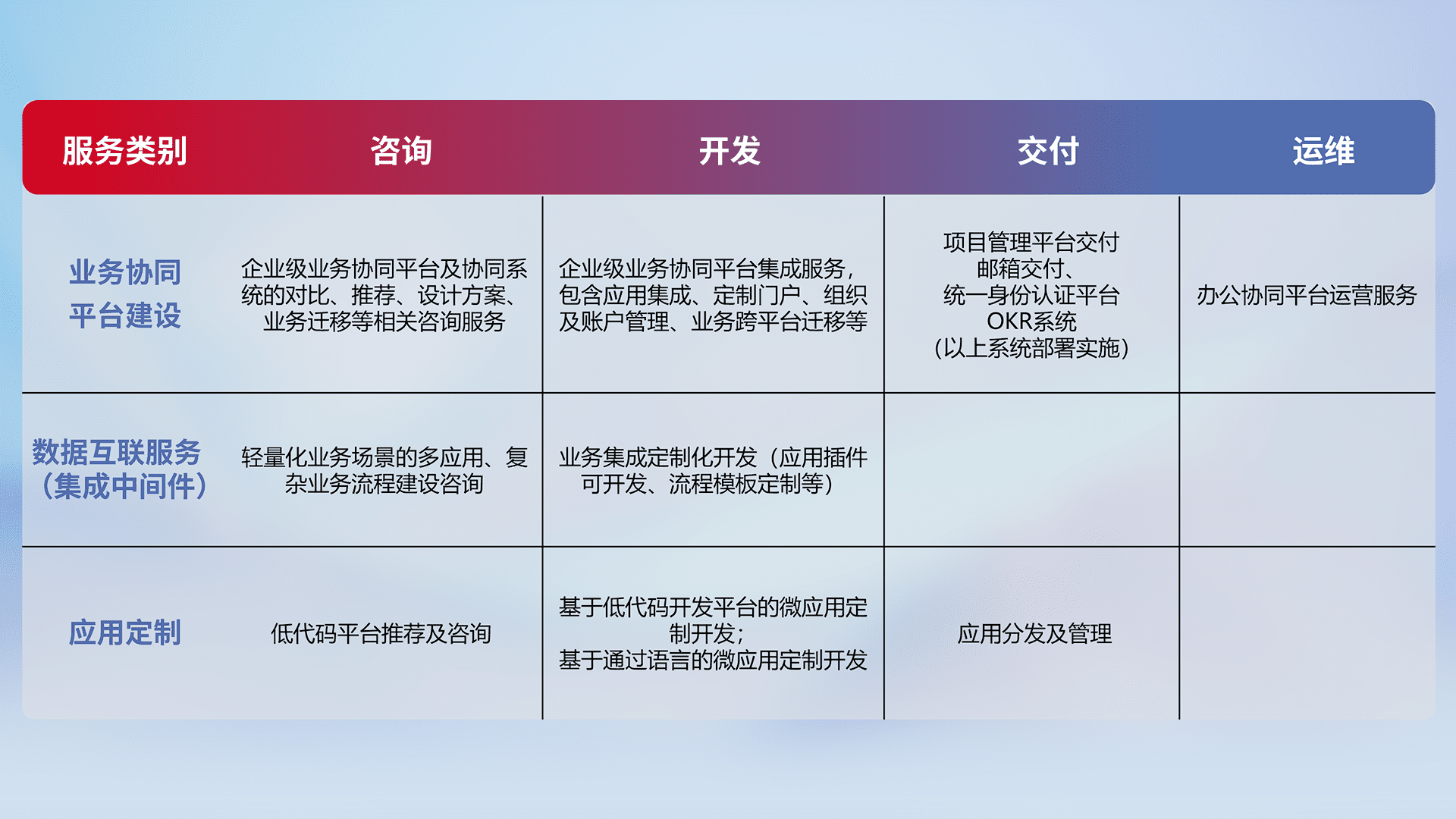 针对钉钉、、、、企微、、、IDaas等平台级产品提供产品的规划、、、方案、、交付、、定制化开发等服务,,,实现如统一协同办公、、智能客户服务、、混合会议管理、、、、智能数据查询、、等业务场景,,,实现数字化转型。。