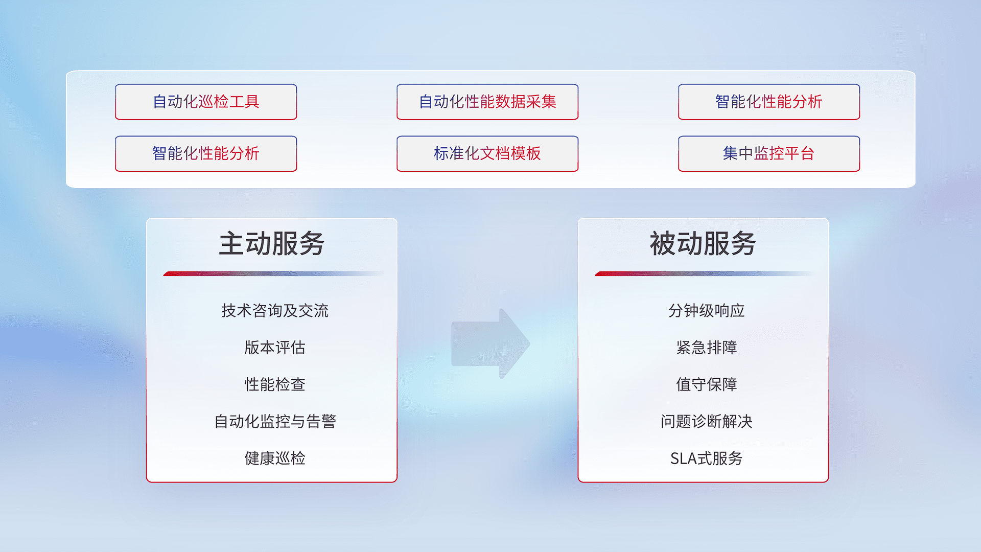 智能化工具和标准化文档,,保障服务质量,,提供主动服务(包含技术咨询、、版本评估、、、性能检查、、、、自动化监控与告警、、、、健康巡检)和被动服务包含(分钟级响应、、紧急排障、、、、值守保障、、、、问题诊断解决、、、SLA服务)。。。。